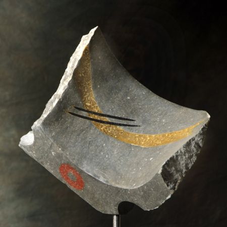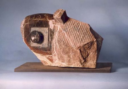 Soms combineert hij in zijn beelden steen met ander materiaal, zoals